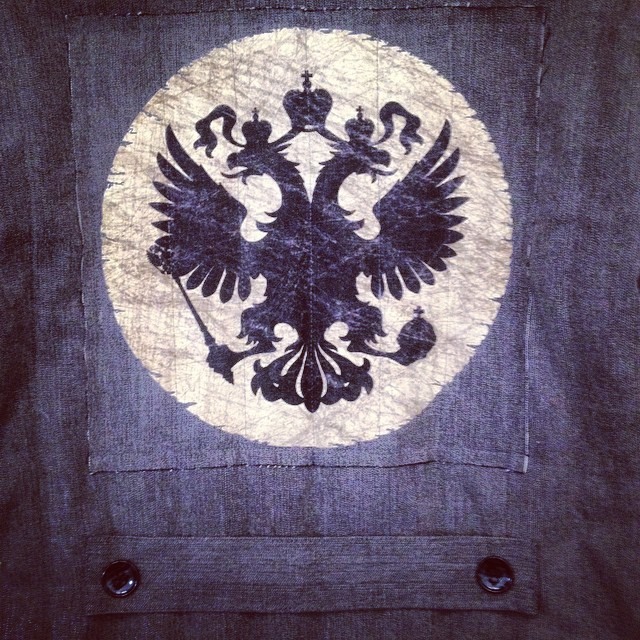Дизайнерская вещь украшена оригинальным принтом: на спине ватника красуется двуглавый орел, а на кармане на лицевой части есть надпись «ВАТНИК ОВ-17122014-61» и логотип дизайнера.