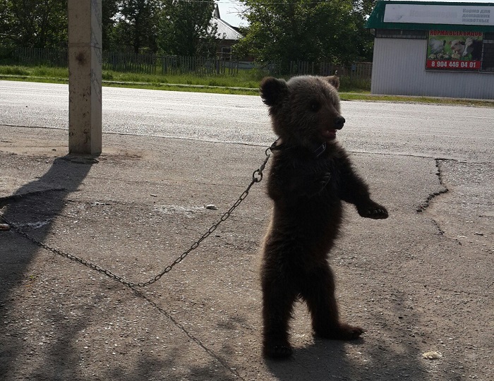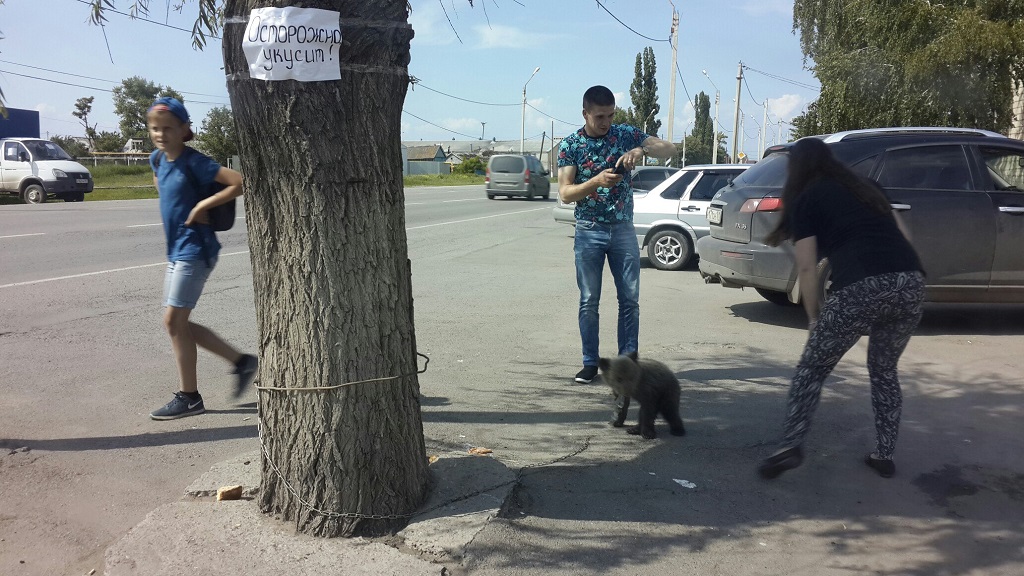 Как сообщают очевидцы, на вид трехмесячного медвежонка держат возле придорожного кафе «Руно» в селе Пешково Азовского района. «Прикованный к дереву на цепи в 1,5 метрах от оживленной трассы, медвежонок пытается спрятаться от палящего солнца в небольшом островке тени, образовавшейся от кроны дерева», — говорится в сообщении Каролины Суворовой.