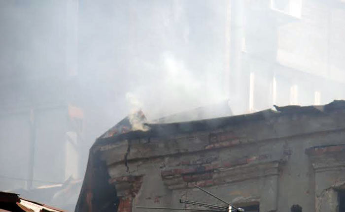 «В настоящее время пожарные продолжают заливать дымящееся здание водой и спецсредствами. В 12:00 на крыше строения был заметен открытый огонь», — рассказал Александр Гончаров по телефону.