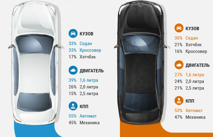 Наиболее востребованными на рынке новым автомобилем в 2015 году эксперты назвали переднеприводной седан или кроссовер белого цвета с автоматической коробкой передач и объемом двигателя 1,6 литра. Типичный подержанный автомобиль в этом году — черный седан с «автоматом» и двигателем до 1,5 литра.