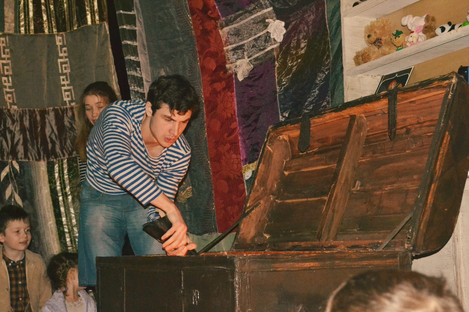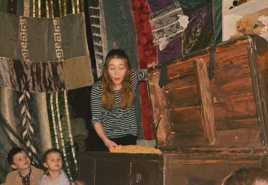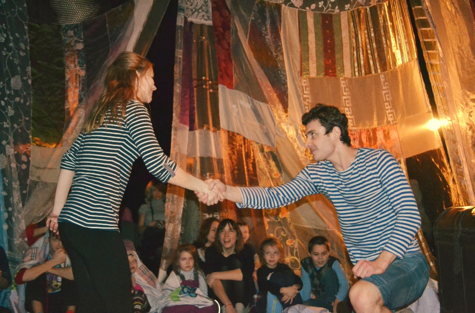 Маленьких гостей сказочного праздника с самого начала сделали участниками представления. Они находились внутри импровизированного шатра, а родители, с которыми они пришли в театр, были за его пределами. Подобное разграничение действительно было способно создать у детей ощущение того, что они стали героями сказки.