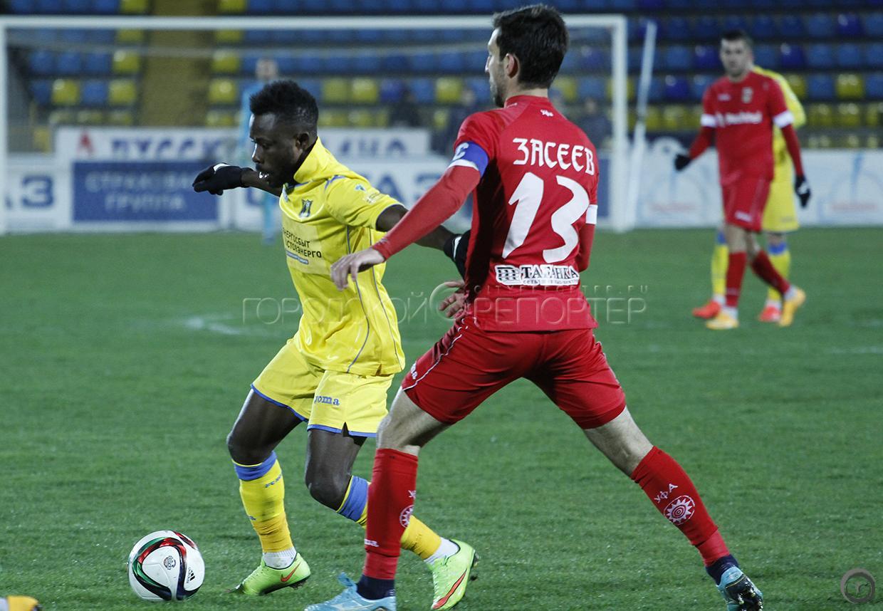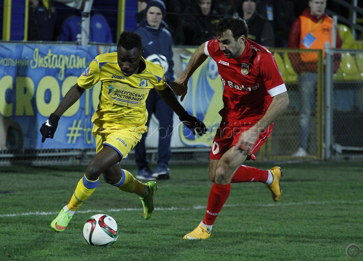 Игроки ФК «Ростов» Александр Бухаров (справа) и ФК «Уфа» Эммануэль Фримпонг в матче 22-го тура ФК «Ростов» — ФК «Уфа» // Фото: Анна Коновалова