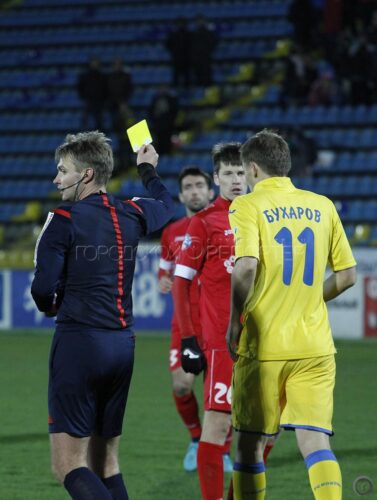 Главный арбитр матча 22-го тура ФК «Ростов» — ФК «Уфа» Сергей Лапочкин показывает желтую карточку игроку «Ростова» Александру Бухарову // Фото: Анна Коновалова