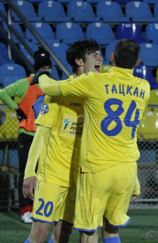 Игроки ФК «Ростов» Сердар Азмун (слева) и Александр Гацкан радуются забитому голу в матче 22-го тура ФК «Ростов» — ФК «Уфа» // Фото: Анна Коновалова