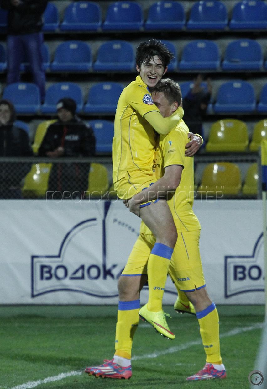 Игроки ФК «Ростов» Сердар Азмун (слева) и Александр Бухаров радуются забитому голу в матче 22-го тура ФК «Ростов» — ФК «Уфа» // Фото: Анна Коновалова