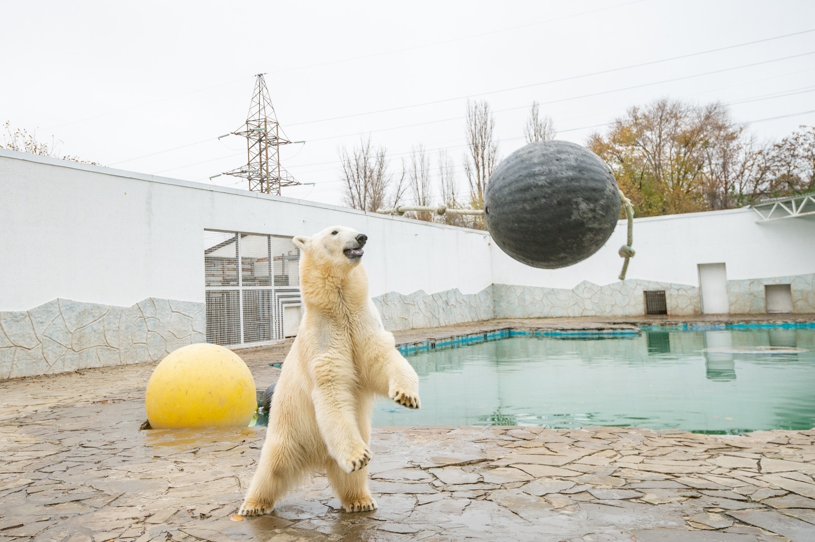 Для медведицы подготовили просторный вольер с бассейном, а также со снежной пушкой, которая генерирует снег в любое время года. Кроме того, есть прохладные внутренние вольеры, которые позволяют Айке в любой момент укрыться от жары.