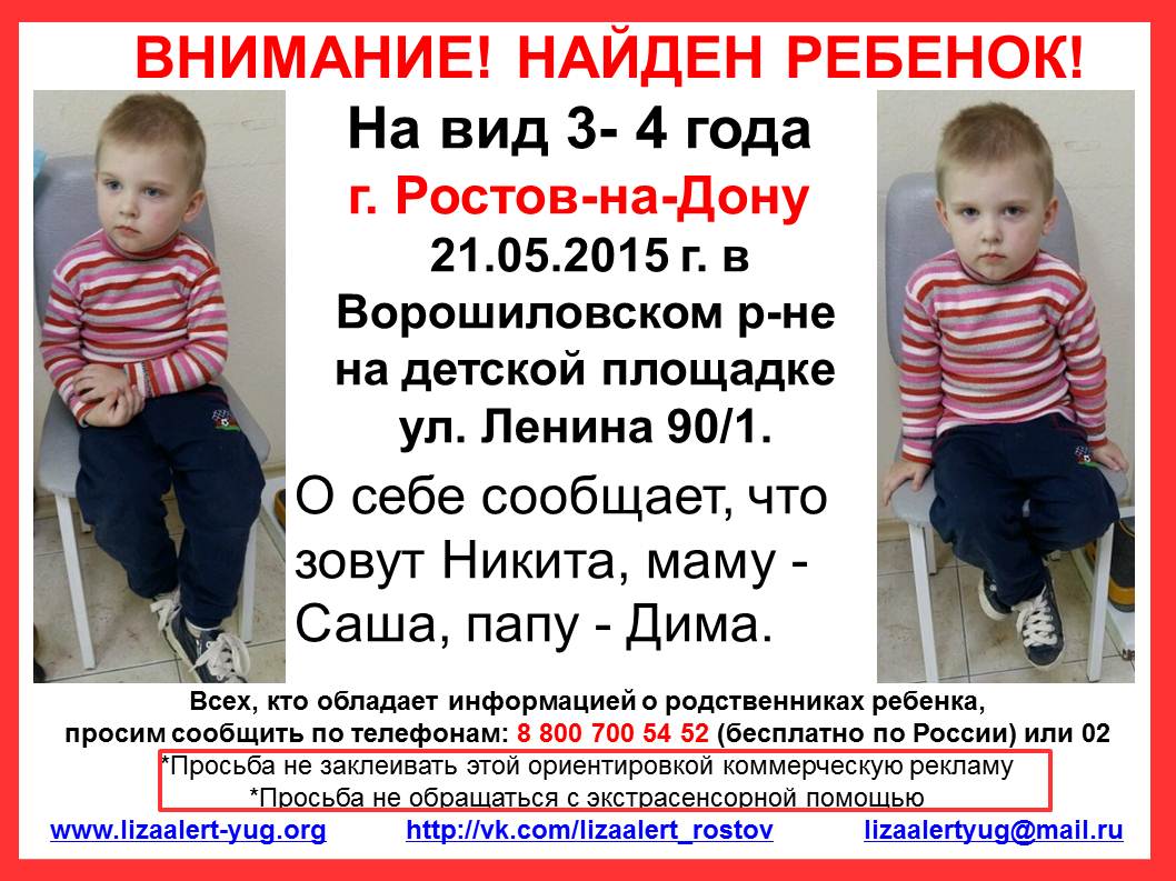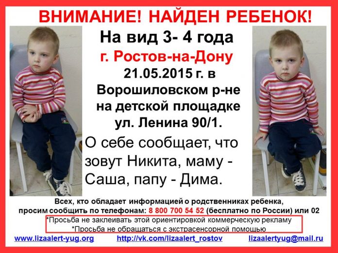 В Ворошиловском районе Ростова на детской площадке найден ребенок. Мальчик 3–4 лет рассказал, что его зовут Никита. Ребенок также смог сообщить, что его маму зовут Саша, а папу — Дима.