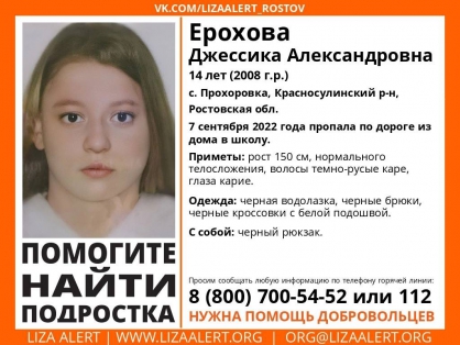 По предварительным данным, утром 7 сентября 2022 года девочка вышла из дома (она живет в хуторе Прохоровка) и направилась в школу, однако до настоящего времени домой Джессика так и не вернулась.