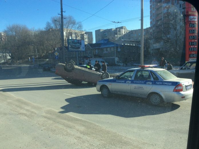 Днем 18 февраля на Темерницком кольце в Ростове произошло ДТП. Иномарка, предположительно «Форд Фокус»,перевернулась и загорелась.