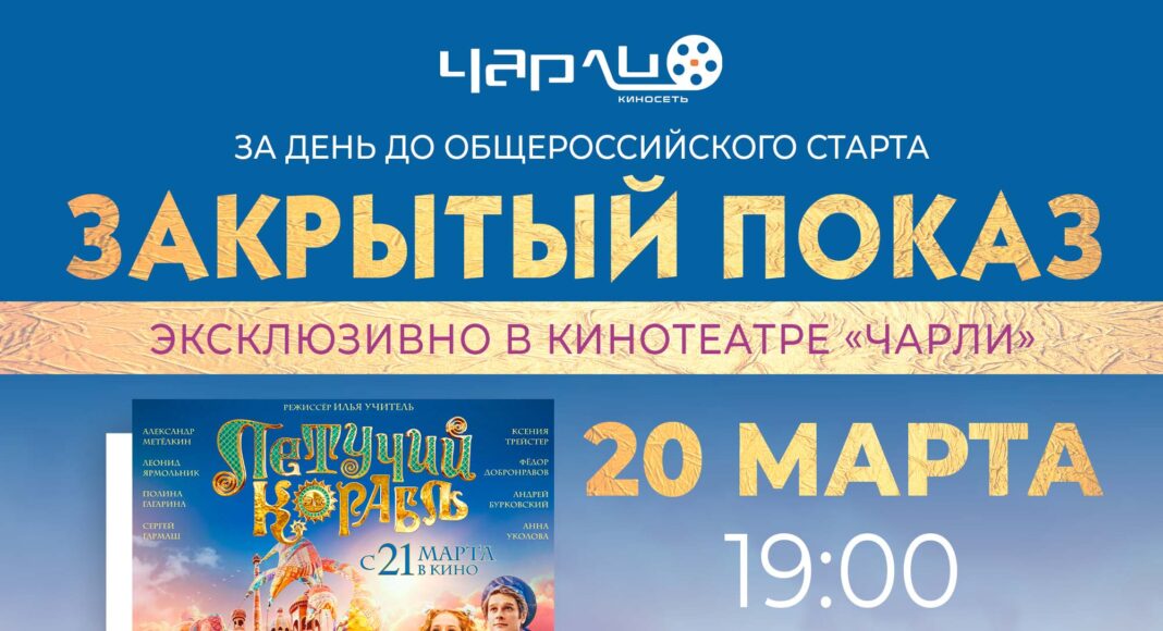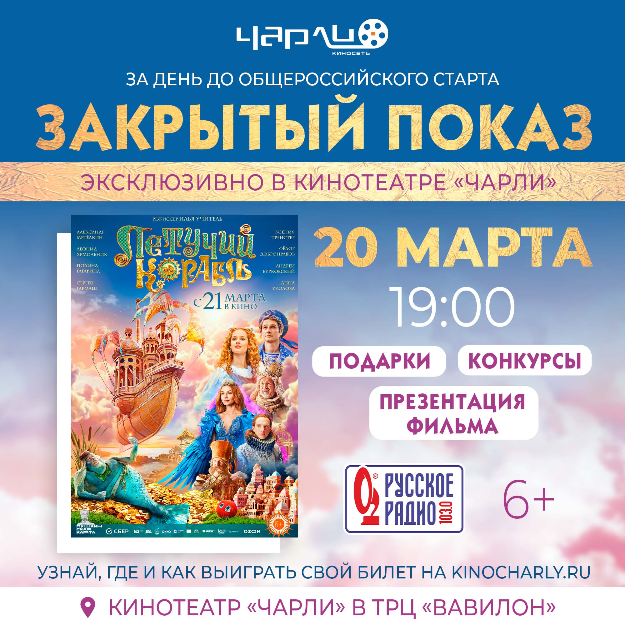 В «Чарли» в ТРЦ «Вавилон»» вас ждут развлекательная шоу-программа, конкурсы, море интересных призов, и самое главное, закрытый показ фильма «Летучий корабль»!