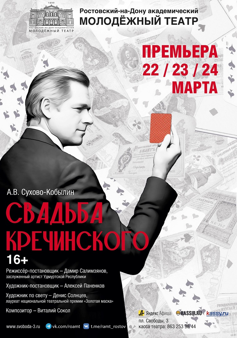 Спектакли по произведениям русской классики неизменно пользуются успехом у публики, поэтому Молодёжный театр вновь обращается к сатирической комедии А. В. Сухово-Кобылина «Свадьба Кречинского». Самые верные зрители Молодёжного помнят одноимённый мюзикл в постановке Владимира Чигишева в 2009 году: главные роли в нём исполняли заслуженные артисты России Валерия Искворина и Николай Ханжаров. Сегодня известный российский режиссёр, драматург, театральный деятель Дамир Салимзянов предлагает новое прочтение этой пьесы, не теряющей своей актуальности. И снова на сцену выйдет блистательная Валерия Искворина, на этот раз — в роли Атуевой. Зажиточный ярославский помещик Муромский — отец взрослой дочери Лидочки, которую пора выдавать замуж. С этой целью семья переехала в Москву, где кипит светская жизнь. На балу Лидочка знакомится с загадочным франтом Кречинским, который не только соглашается стать её женихом, но и сам торопит сыграть свадьбу. Однако, для счастливого брака есть препятствие: Кречинский одержим страстью к карточной игре, и Лидочка для него — отличная возможность сорвать большой куш…