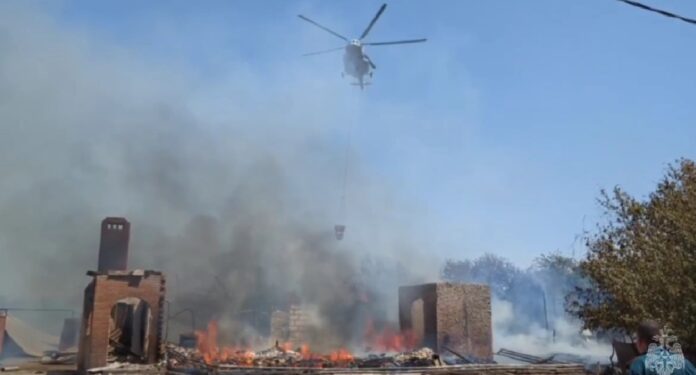 Сначала загорелся деревянный дом, затем пламя перекинулось еще на два дома и 7 хозпостроек. В общей сложности в Золотом Колосе загорелись 10 построек — 3 дома и 7 нежилых строений.