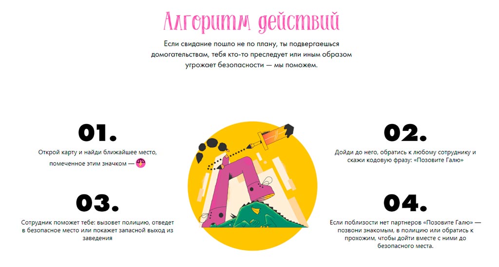 Если женщина в опасности, ее преследуют или пристают к ней, можно зайти в любое заведение, которое участвует в проекте и обратиться к сотруднику с кодовой фразой «Позовите Галю». Работник отведет девушку в безопасное место, и они вместе решат, что делать дальше: вызвать полицию или такси, позвонить родственникам или просто сбежать через запасной выход.