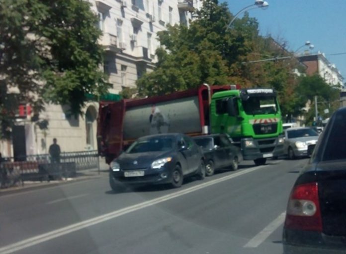 Сегодня днем в районе здания аппарата полномочного представителя президента РФ в ЮФО мусоровоз MAN, маневрируя в стесненных дорожных условиях, совершил наезд на автомобиль ВАЗ-2107, который, в свою очередь, ударил впереди стоявший Pegeot 308. В результате грузовик перегородил все три полосы движения по Садовой в сторону вокзала, а на улице образовался крупный затор.