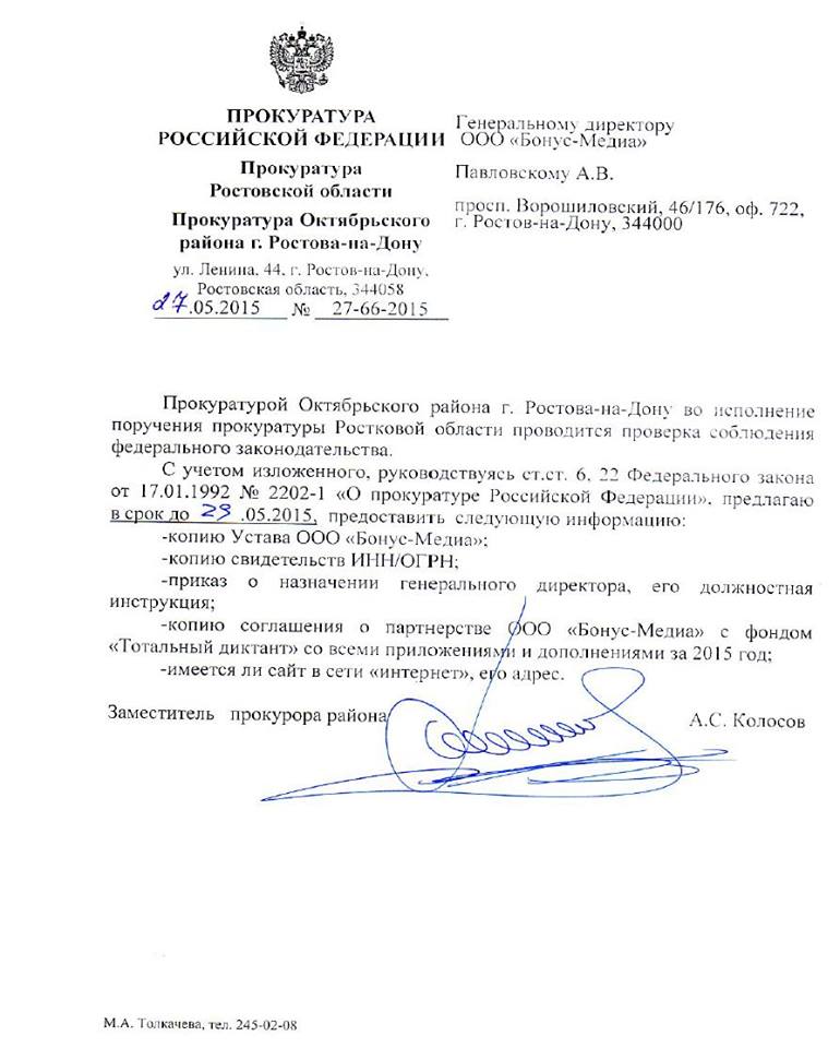 Организатору проверки грамотности населения в Ростове предстоит представить сотрудникам прокуратуры уставные документы организации, копию соглашения с фондом «Тотальный диктант» и некоторые другие документы.