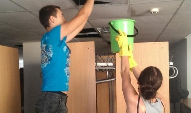 На всех трёх этажах с подвесных потолков на головы льётся вода. Поэтому студенты сначала прокалывают гипсокартон потолочных плит ножом, затем быстро подставляют вёдра, и только потом снимают сами плиты. Намокший гипсокартон утилизуют, а в потолке зияет всё больше чёрных дыр.