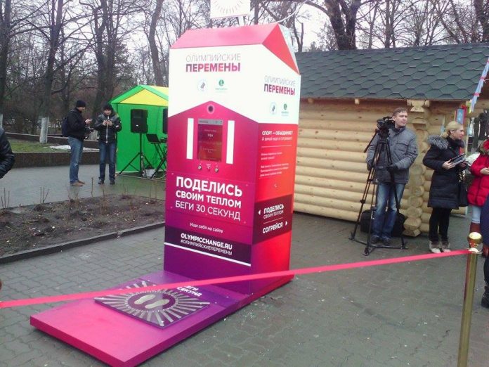 Акция «Олимпийские перемены» стартовала год назад в Москве. Тогда в московском метро был установлен специальный аппарат, который выдавал разовый проездной билет тем, кто мог присесть 30 раз подряд. Через год акция получила продолжение. С конца января в нескольких российских городах установлены автоматы, способные переработать физическую энергию в тепло. К программе подключился и Ростов-на-Дону.