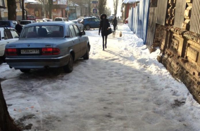 Ростовчане массово выкладывают в социальных сетях фотографии льда на улицах города. В то время, как дороги расчищены и проезд транспорта практически не затруднен, пройти по тротуару в различных участках города невозможно.