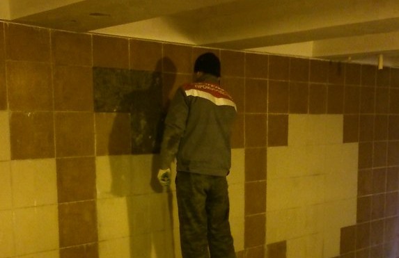 Тарас Фисун опубликовал у себя на странице фотографию, на которой видно, как рабочий перекладывает часть плитки на стене перехода, который был сдан всего полгода назад.