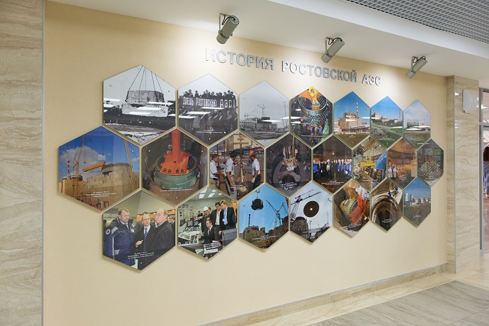 Там же на стенах оформлены в виде сот различные коллажи: лучшие работники, другие станции России и их директора, история станции от закладки первого камня до введения в эксплуатацию третьего блока.