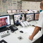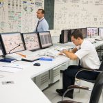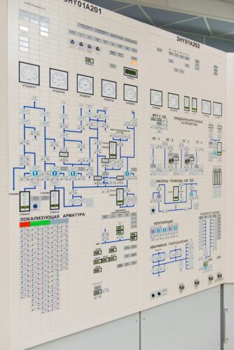 В кабинете за большими пультами работники АЭС следят за подачей тока по линиям, регулируют процесс. Они следят за тем, чтобы все проходило без сбоев, связываются с подстанциями при необходимости. Их кабинет напоминает кабину самолета — столько здесь цветных лампочек и датчиков.
