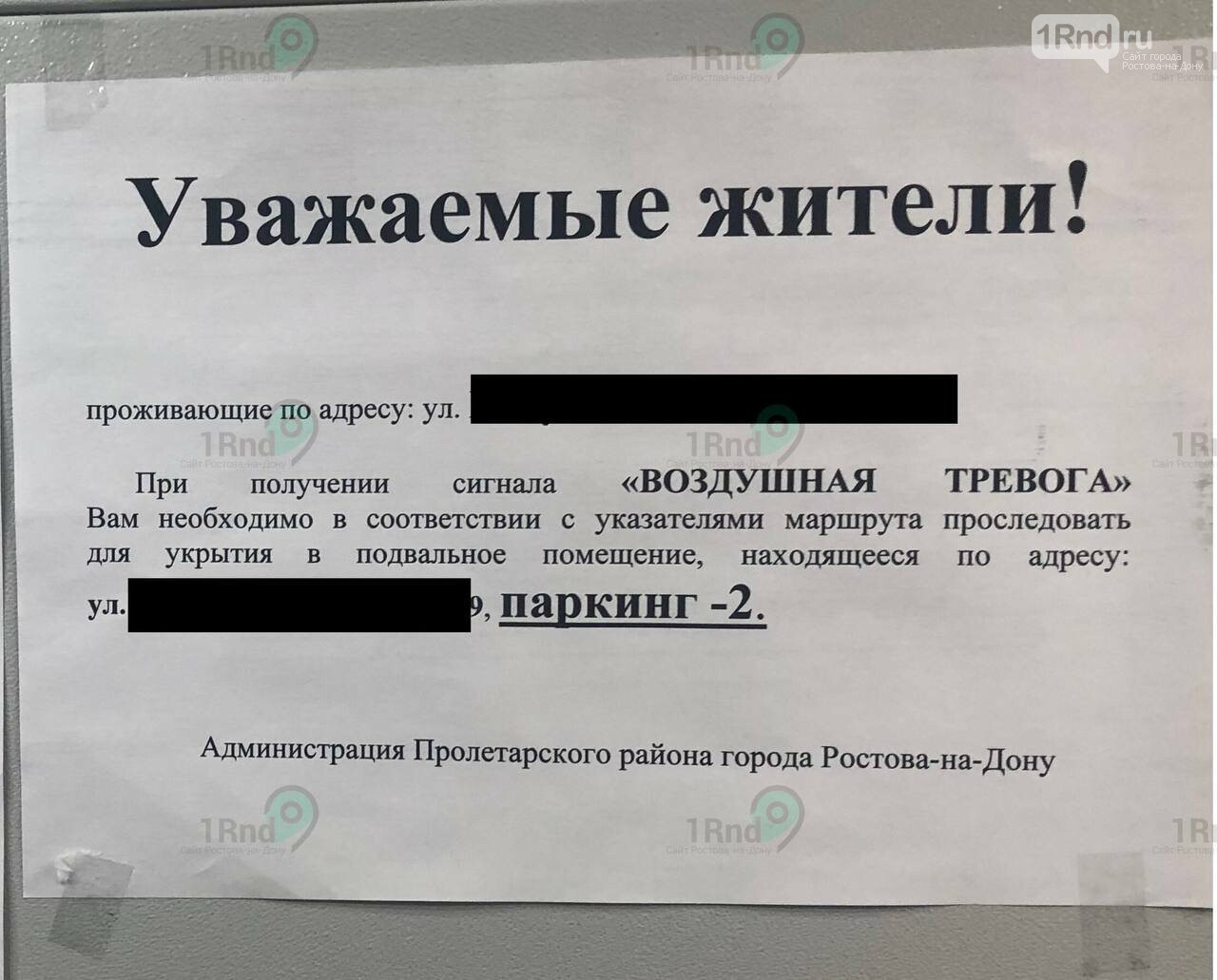 В Ростове в многоквартирных домах в Пролетарского района начали появляться инструкции с действиями на случай воздушной тревоги. Об этом начали сообщать в среду, 2 ноября, региональные СМИ. Фотографию одного из таких информационных листков получила и редакция «Городского репортера».