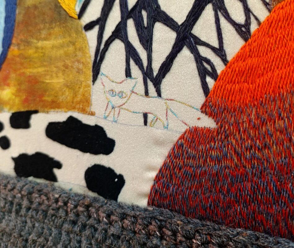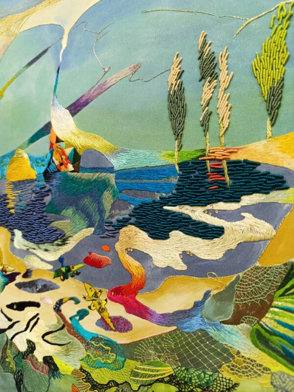 Анна Семененко представила серию вышитых композиций. В них строгие геометрические линии переплетаются с мягкими образами природы. На первый взгляд это красивые узоры и цветовые акценты, но каждый фрагмент наполнен воспоминаниями и смыслом автора: от детских прогулок по донским полям до семейных традиций, сохранившихся сквозь поколения.