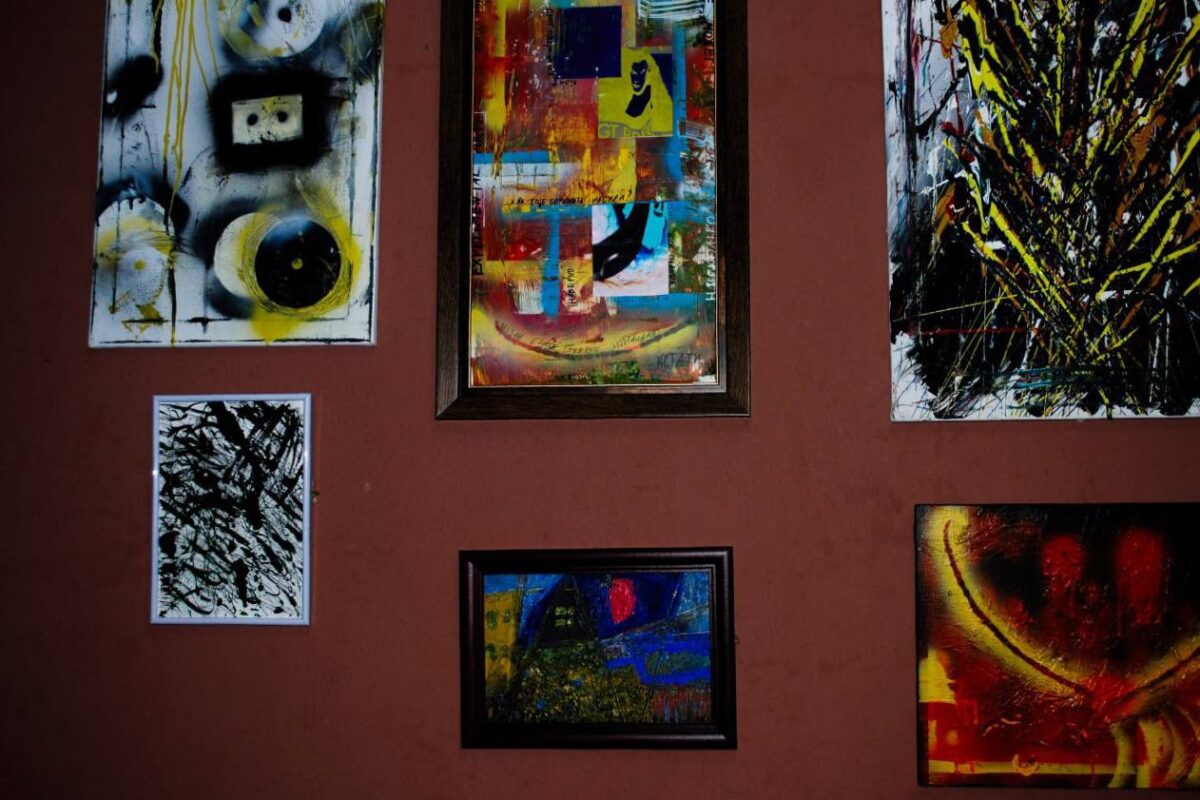 Затем художник перешёл к основной части мероприятия — экскурсии. Картины были ровно и старательно развешаны по периметру стен. Лично мой вечер начался с довольно-таки мрачной и нервной абстракции «Телефонный разговор». Одна гостья поделилась, что однажды увидела эту картину на другом мероприятии, а вечером того же дня у неё случилась ссора по телефону. Женщина была убеждена, что именно картина предупредила её о неприятности. Сам художник написал холст, когда телефонный разговор с приятелем слишком затянулся, и необходимо было себя чем-то занять. Пока длился этот бесконечный разговор на свет появилась картина.