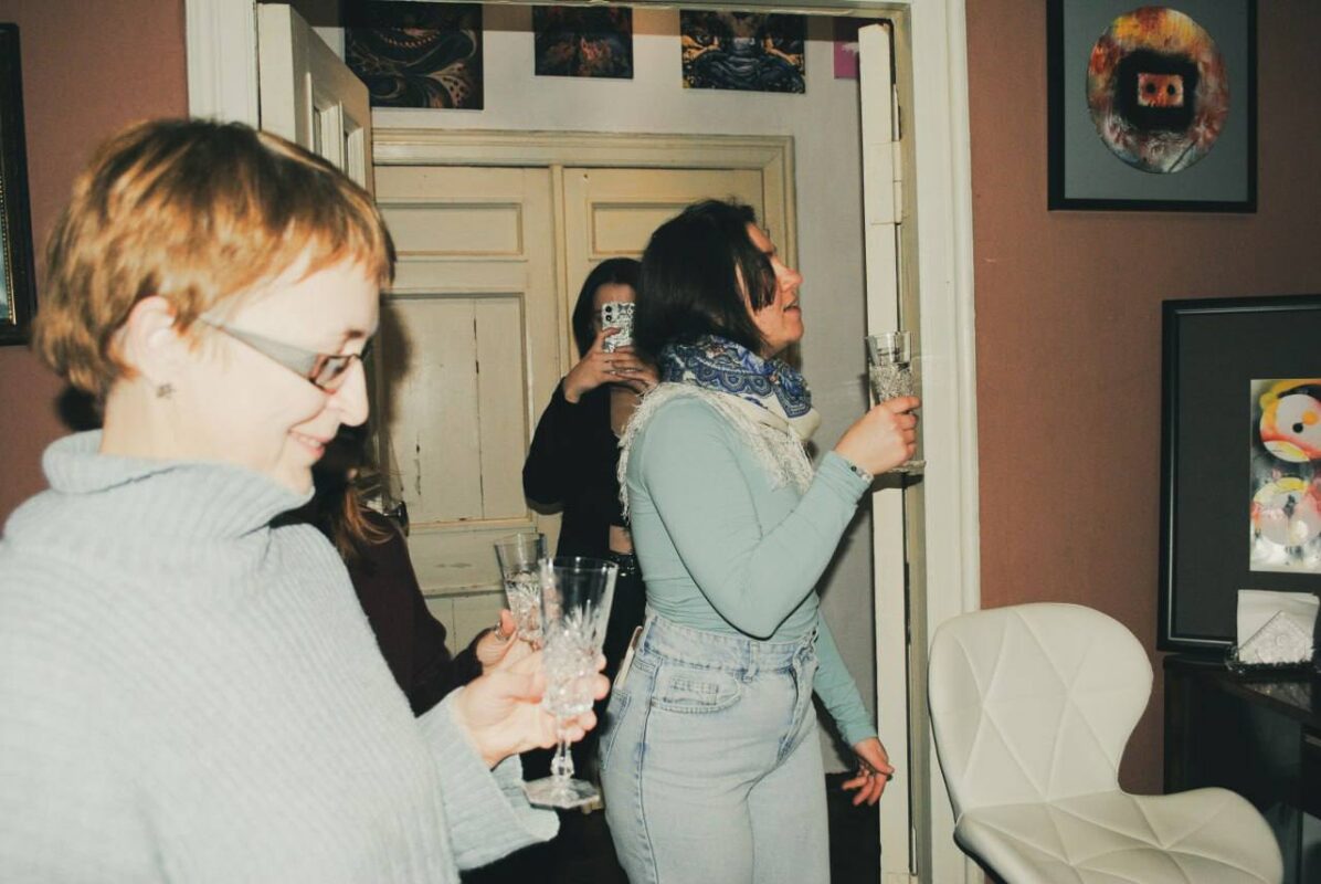 Поднимаясь на третий этаж, Валерий сообщил нам: «Это старый послевоенный дом приблизительно 50-х годов, решили провести выставку тут, мой знакомый предоставил квартиру в пользование». Войдя в коммуналку, мы увидели высокие потолки и узкий коридор, завешанный картинами различных художников. Справа нас встречала праздничная старинная деревянная дверь со стеклянными вставками. В помещении уже собрались посетители выставки, хозяин наполнил хрустальные бокалы шампанским и предложил сладкое.