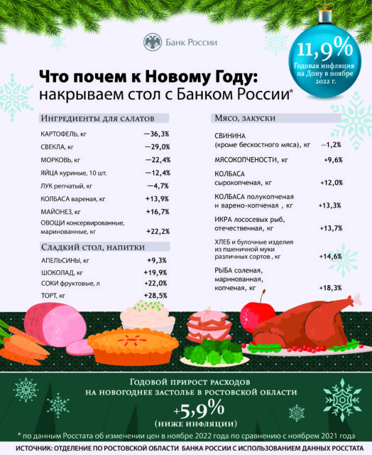 В Ростовской области новогодний стол в 2022 году подоражал незначительно. Экономисты Банка России отметили, что общая стоимость блюд выросла на 5,9%. Об этом сообщает пресс-служба отделения по Ростовской области Южного ГУ Банка России.