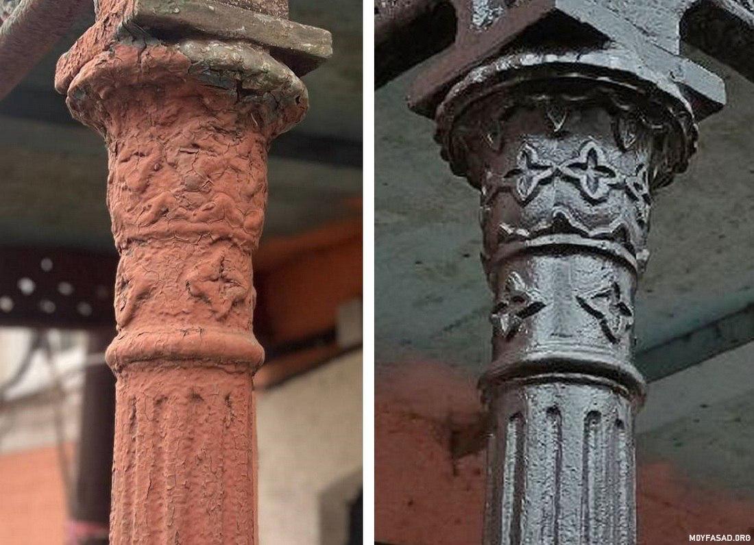В декабре 2025 года специалисты очистили архитектурный элемент от многочисленных слоев краски, которые скрывали художественный рельеф. После отжига краски они обработали детали черной эмалью — покрытием, которое идеально подходит для чугунных изделий дореволюционного периода.