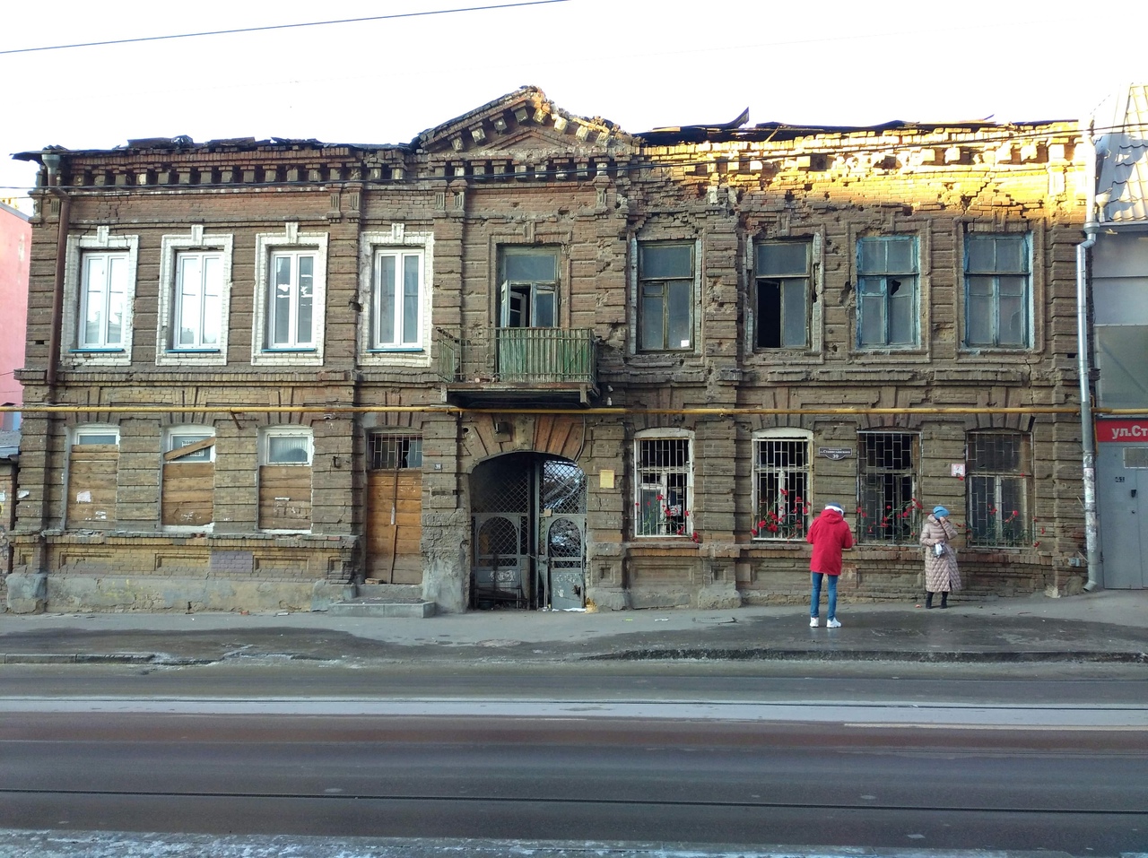 Здание на Станиславского, известное как «дом-ветеран», было построено в начале XX века. На фасаде этого дома сохранились следы от пуль времен Великой Отечественной войны. Два года назад власти уже пытались отдать дом под снос, но тогда общественность отстояла этот дом.